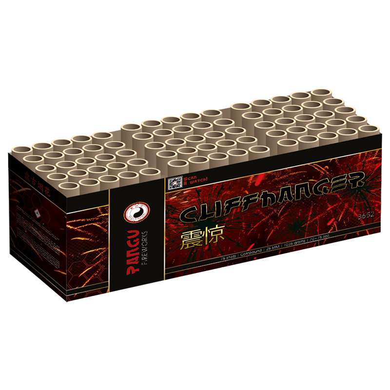 Cliffhanger, 75 shots 25mm compound. n nProductinformatie: nType product: Siervuurwerk nEffect product: Compound nTube diameter: 25mm nFanshape: Nee nClassificatie: CAT.F2 nMinimale leeftijd: 16 jaar nLegaal afsteken op: 31 december nVeiligheidsafstand: minimaal 8 meter nGeschikt voor smalle straten: Ja nGeschikt in Gemeente vuurwerkverbod: Nee Cliffhanger 75 shots 25mm Goedkoop vuurwerk kopen bij Vuurwerkwinkel Harderwijk