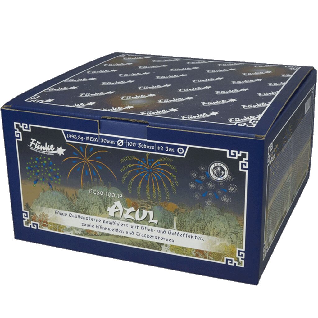 n n100 schoten van 30mm samengesteld vuurwerk met effecten van blauwe sterren, gecombineerd met knipperende en gouden effecten, evenals knipperende wilgen en cracker sterren. n n Funke Fireworks Azul 100 Shots Goedkoop vuurwerk kopen bij Vuurwerkwinkel Harderwijk