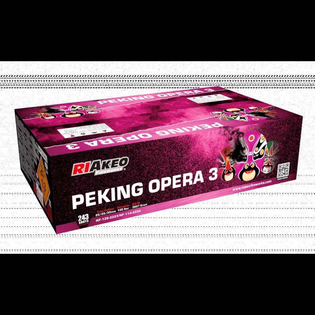 nDie Peking Opera 3 von Riakeo ein Doppel Verbundfeuerwerkn(243 Schuss geschossen  im Kaliber 20/25/30mm und knapp 3,9kg NEM)n  n n Bukett-Effekte:n nnnDiverse Effekte wie Goldweiden, Blinker oder Cracklinpalmen mit kräftigen Poppingflowers Finale.