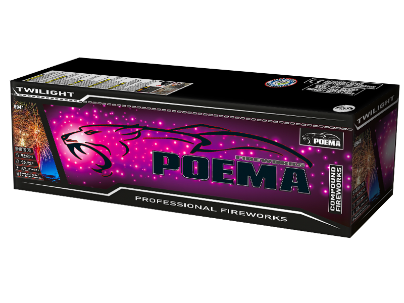 Twilight nEen wederom fenomenale compound uit de Poema-serie. Zet met 75 schoten de straat op de kop! n nKruitgewicht 942 Gram nTube diameter 25 nBrandtijd 45 Seconden nHoogte 25 m. – 30 m. Twilight Goedkoop vuurwerk kopen bij Vuurwerkwinkel Harderwijk